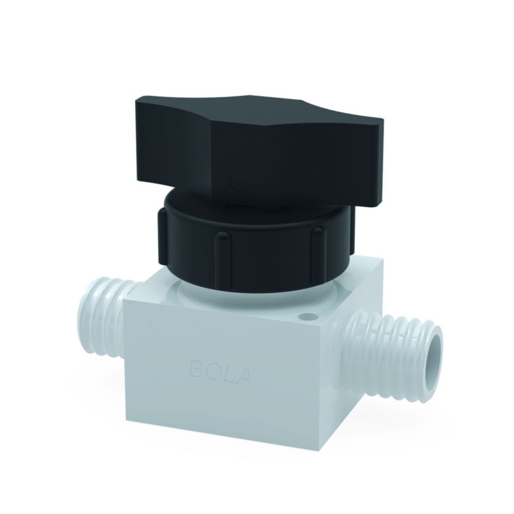 Ball valves with GL screwthread made of chemically resistant PTFE. Maximum permissible atmospheric temperature 150°C, passing media can be as hot as 220°C.