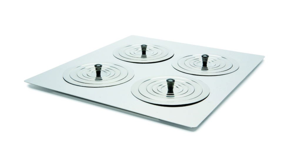 Flat lid for unstirred water baths. With ring sets of variable hole diameter to accommodate tall vessels whilst reducing evaporation.