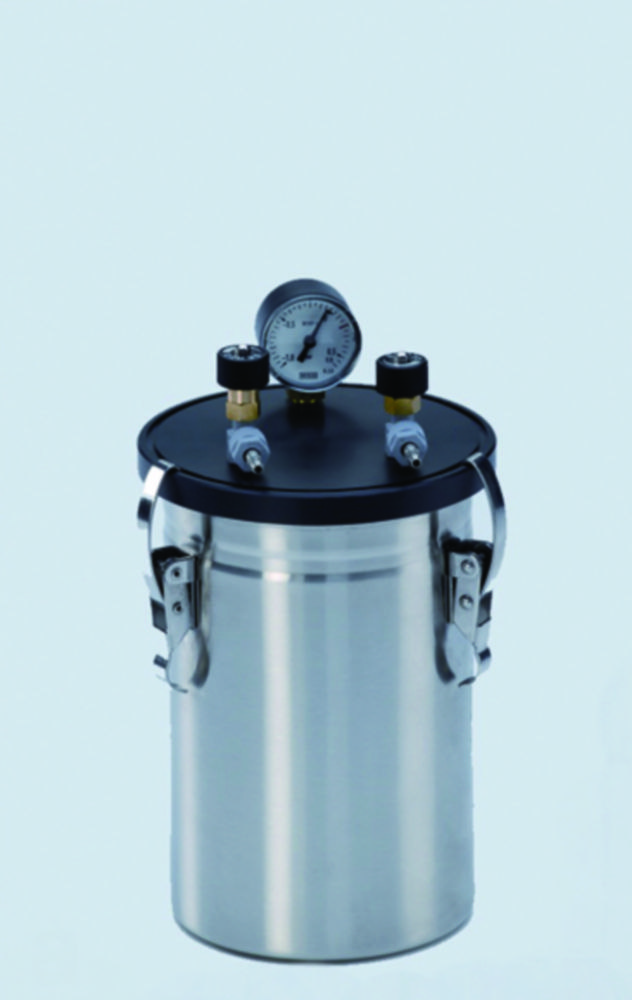 The lids are made of UV-resistant plastic with two corner valves incl. tube clips for vacuum hoses (5 mm i.d.) and with manometer for exact control of the vacuum or overpressure from -1 to 0.2 bar.