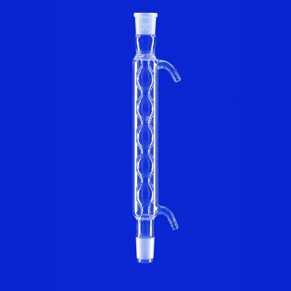 Allihn condensers acc. to DIN 12581 and in addition to DIN, for condensing vapours, with NS socket and NS cone, water connection with glass olives, made of DURAN® tubing