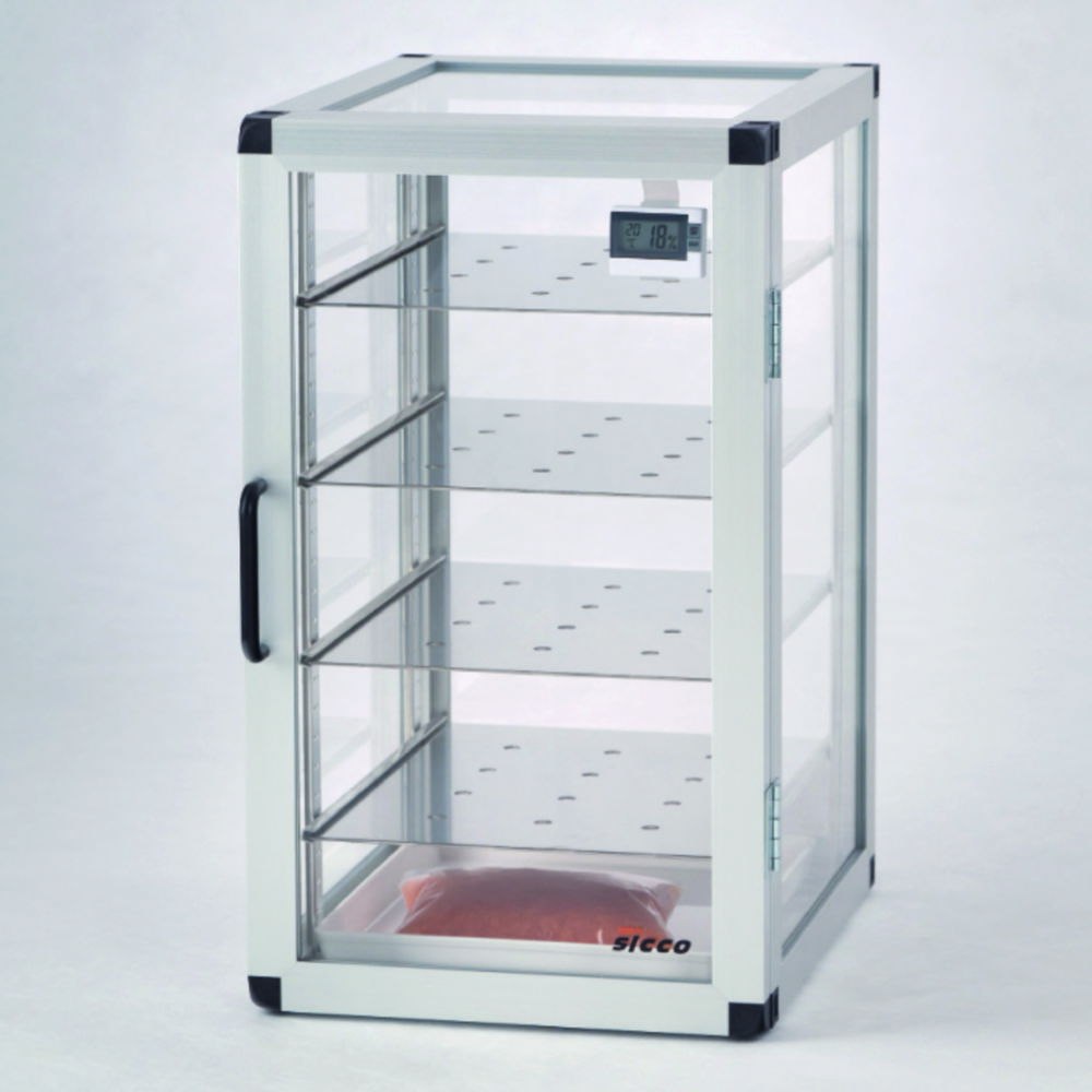 Panels made of borosilicate glass 3.3, including four shelves made of stainless steel, tray, hygrometer and desiccant, usable with up to 26 shelves, stackable.