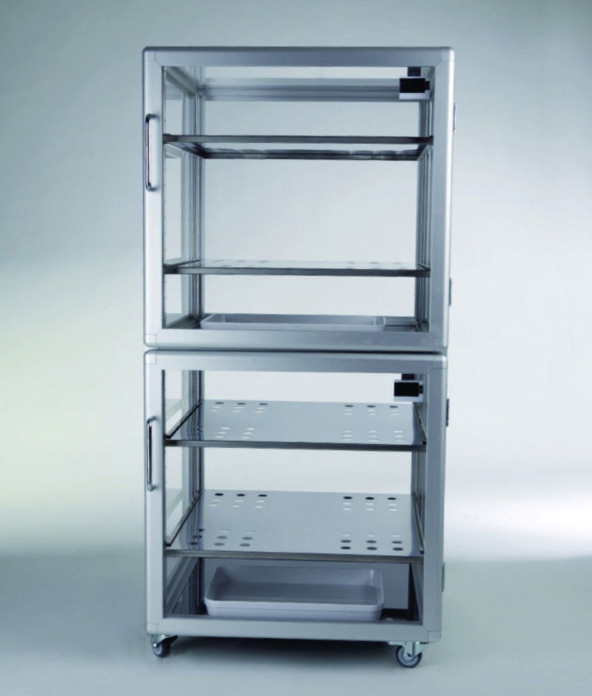 Aluminium frame with acrylic panels. Two chambers, two doors, each chamber usable with up to 8 shelves. Including four shelves, two trays and two hygrometers. Internal dimensions and nominal volume per chamber.
