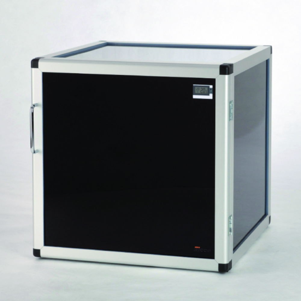 Black, non-transparent acrylic glass panels reduce light incidence and protect against ultraviolet radiation. Including two shelves made of stainless steel, tray and hygrometer, usable with up to 8 shelves.