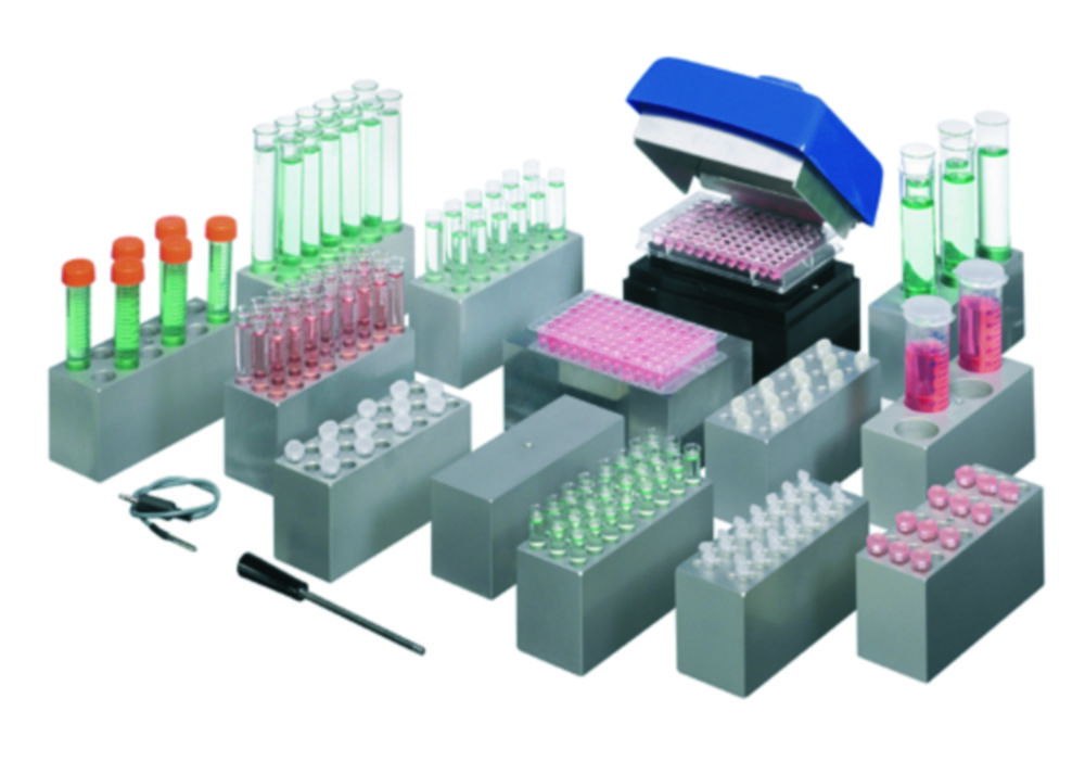 Accessory blocks for QB series only. Interchangeable. Aluminium. Block dimensions (L x W x H): 140 x 50 x 63 mm. For e.g. test tubes or microliter vials from 0.2 ml to 2.0 ml.