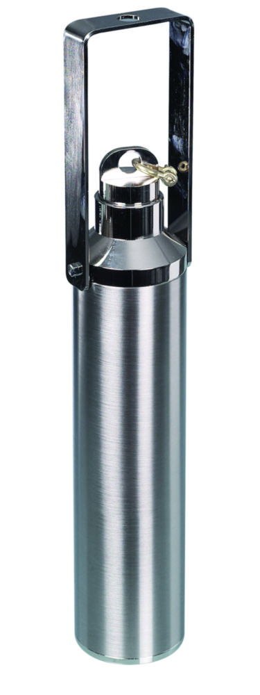 Operation: 1. Lower bottle into liquid. 2. Pull the cable when the target spot has been reached and the stopper opens. 3. Sample flows in. 4. Pull up dipping bottle and remove sample. Use an electrically conductive, manually operated reel and lowering cable or chain.