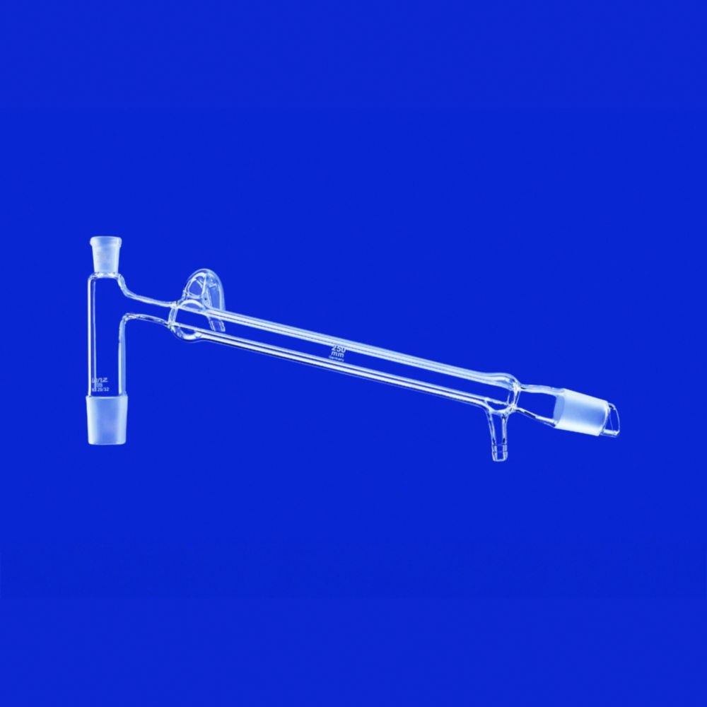 Made of DURAN® tubing. Distilling links with Liebig condenser, outlet with NS cone, water connection with glass olives, with socket NS 14/23 for distillation thermometers of 55mm built-in length.