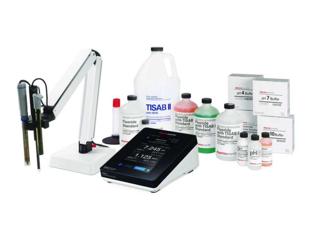 Scope of supply: Dual channel pH/ion meter, electrode stand, refillable pH/ATC electrode with epoxy shaft (8157BNUMD), ion selective fluoride electrode (9609BNWP), stirrer probe (096019-WA), pH buffers 4, 7, 10 and rinse solution (pouches), storage and cleaning solution for pH electrode, pH electrode storage sleeve and base, fluoride standard 100 ppm, fluoride standard 0.5, 1 and 5 ppm premixed with TISAB II, TISAB II solution, USB flash drive, PC cable, universal power supply with plug adapter EU, UK, US, AUS and China