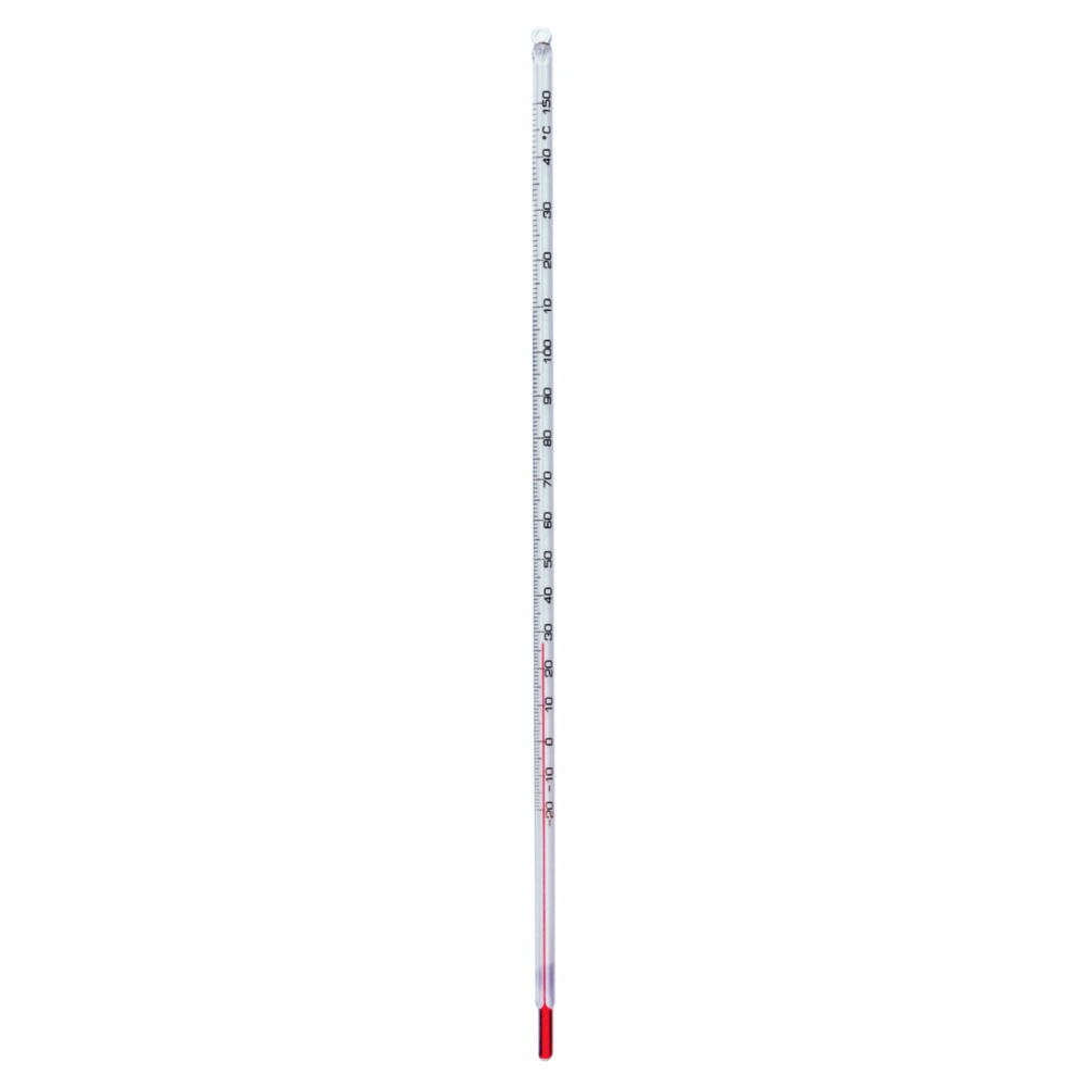 Glass, solid stem, with loop, white backed. With red organic filling. Single packed in plastic square shucks. Can be used as a stirring thermometer. With temperature resistant safety coating up to 250 °C. Single packed in plastic square shucks.
