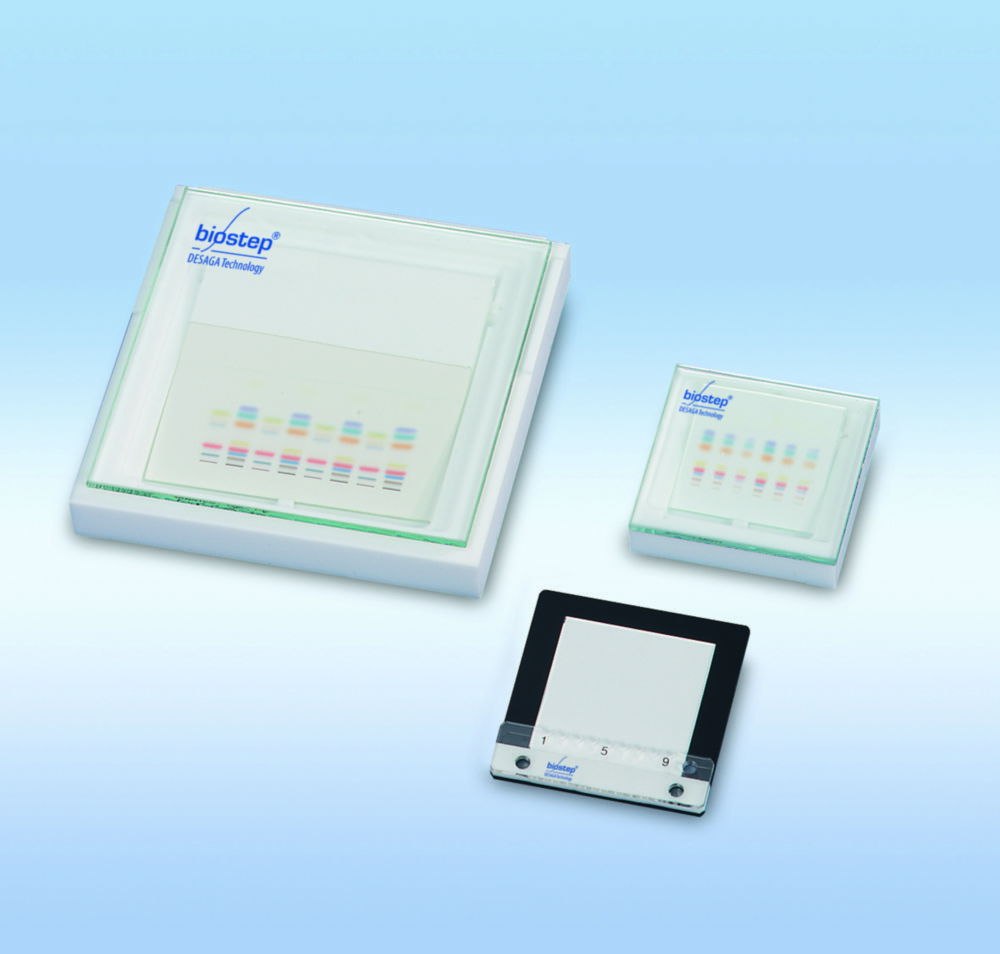 The H separating chambers make optimum use of HPTLC gel layer advantages. Small particle size 5µm, stringently controlled pore size and distribution, and more theoretical bases. Excellent value for money and can be supplied for time and cost saving in 50mm x 50mm plate format or traditional 100mm x 100mm format. Optimum separations are achieved even on the shortest runs.