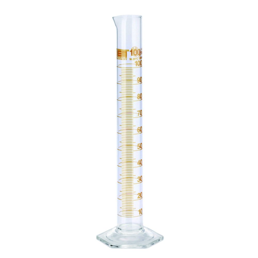 IN (TC) calibrated. With spout and hexagonal glass base. Main point ring graduation. With dated batch identification. Declaration of conformity acc. to DIN 12600. With durable amber stain graduation, acc. to DIN EN ISO 4788.