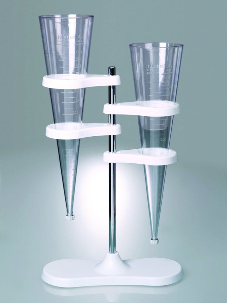 The stand for sedimentation funnels is used to keep, hold or store Imhoff funnels safely and reliably during sedimentation. Two funnel holders ensure that Imhoff funnels will be held safely and securely and can be placed in an absolutely vertical position. Stand with two holders for sedimentation funnels, suitable for funnels 90 mm or more in diameter. Thanks to an innovative magnet concept no clamping screws are necessary. The height of the funnel holder can be adjusted easily and flexibly with one hand. With the corresponding accessory the holders for Imhoff funnels can also be replaced by holders for all-purpose funnels.